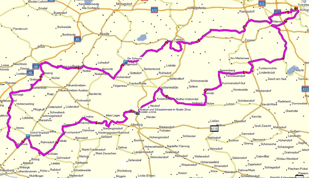 Von unserem Start- und Zielort Königs Wusterhausen führt uns der Weg über kleine Nebenstraßen in Richtung Trebbin. Auch wenn die Kurven in der Region nicht unbedingt eine Herausforderung darstellen, finden wir immer wieder schöne Abschnitte, an denen sich mehrere Kurven aneinander reihen. Leider haben es die Gesetzeshüter nicht gut mit uns gemeint und die schönsten Abschnitte mit Geschwindigkeitsbegrenzungen für Motorräder belegt. An der Scheune, einem beliebten Bikertreff, machen wir Pause und stären uns mit einem Kaffee und einem Stück Kuchen, bevor es über Landesstrassen zum Schloss Kropstädt geht.