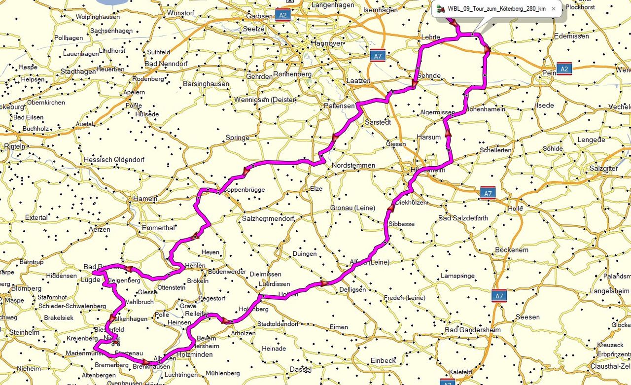 Von Burgdorf geht es über Lehrte, Sehnde, Sarstedt nach Nordstemmen, wo uns ein traumhafter Blick auf das Schloss Marienburg erwartet. Für eine Pause ist es noch zu früh und so führt uns der weitere Weg in Richtung Coppenbrügge, wo uns die ersten schönen Kurven begleiten. Nach einem Zwischenstopp im Museum für Landtechnik und Landarbeit in Börry setzen wir mit der Fähre über die Weser und folgen den Kurven über Bad Pyrmont bis zum Köterberg - einem beliebten Treffpunkt für Biker. Nach eine ausgiebigen Mittagspause geht es auf den Heimweg. Die Weser überqueren wir erneut mit der Fähre und nehmen dann die bekannte Strecke über Grünplan in Richtung Alfeld, die uns eine Reihe schöner Kurven bietet. Unser weiterer Weg führt uns südlich an Hildesheim vorbei und auch hier wird uns eine sehr schöne und kurvenreiche Strecke geboten. Leider gelten auf Grund der mehr oder weniger schlechten Straßen Geschwindigkeitsbegrenzungen, die den Spaß etwas mindern. Hinter Grasdorf schwenken wir in Richtung Norden, wo es über Hämelerwald, Sievershausen dann wieder nach Burgdorf geht.